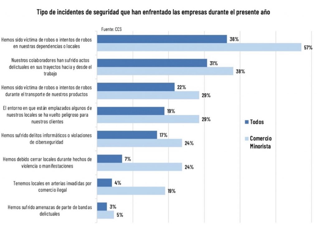 El robo de mercancías durante su transporte también es un tipo de incidente que se ha vuelto habitual para las empresas, afectando al 22% de ellas y a un 29% de las minoristas en el presente año. Para este último sector, los cierres forzados de locales durante manifestaciones o hechos de violencia llegan al 24% de las empresas, mientras que la invasión de la vía pública en que se ubican sus locales afectan al 19%.