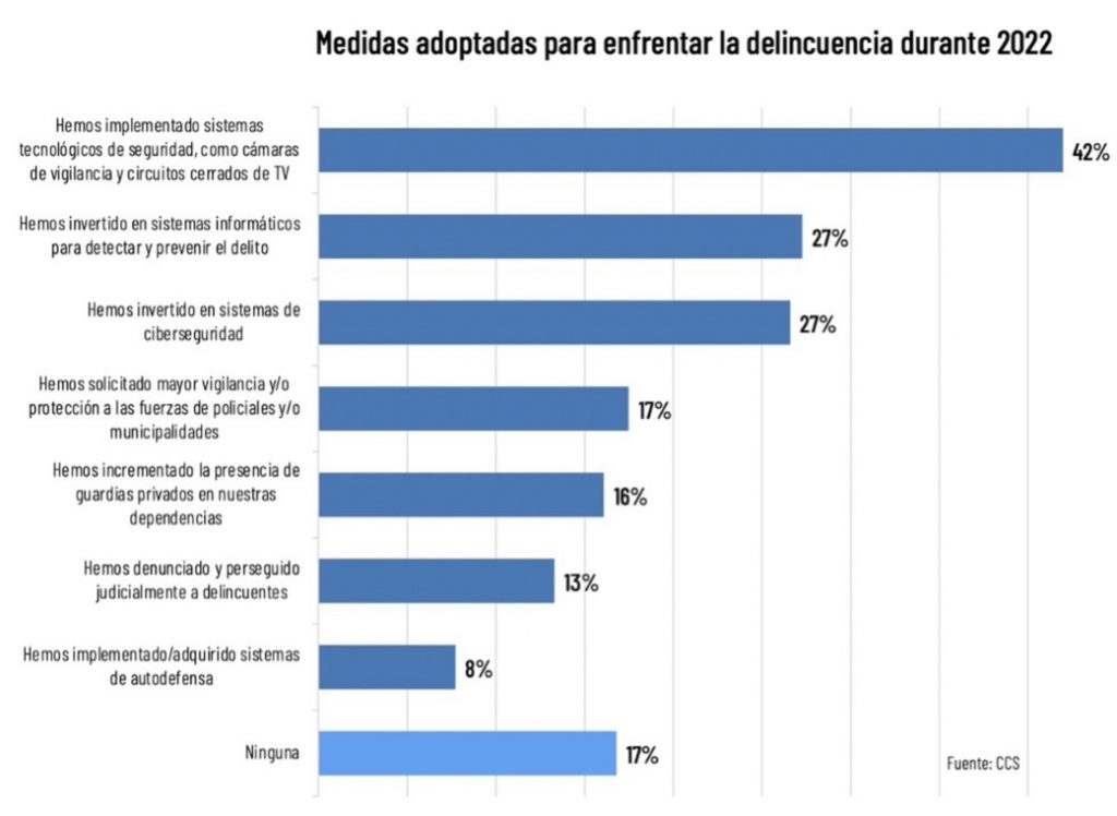 Ante estos riesgos de seguridad, las empresas han emprendido diversas acciones. La mayoría, un 42%, revela haber implementado sistemas tecnológicos de seguridad, como cámaras de vigilancia y circuitos cerrados, mientras un 27% ha invertido en sistemas informáticos para detectar y prevenir los delitos, misma proporción que ha adquirido sistemas de ciberseguridad.