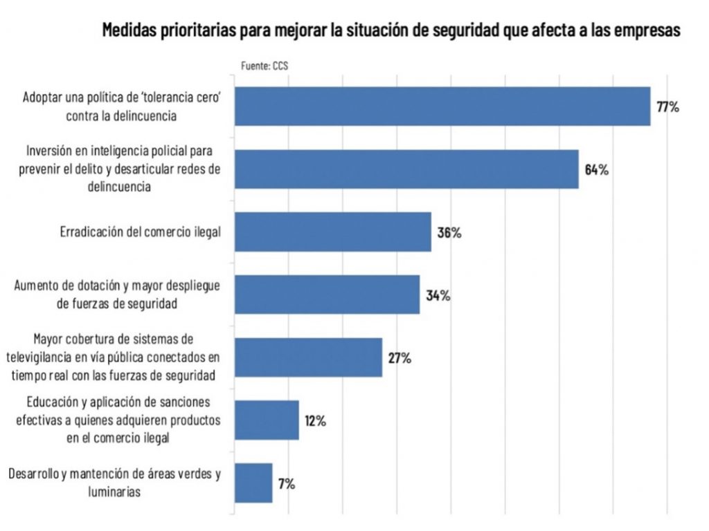 Al ser consultadas sobre el tipo de medidas prioritarias que se deberían impulsar para enfrentar esta situación, una clara mayoría de las empresas se inclina por adoptar una política de cero tolerancia contra la delincuencia (77%), y por aumentar la inversión en inteligencia policial para prevenir el delito y desarticular sus redes (64%).