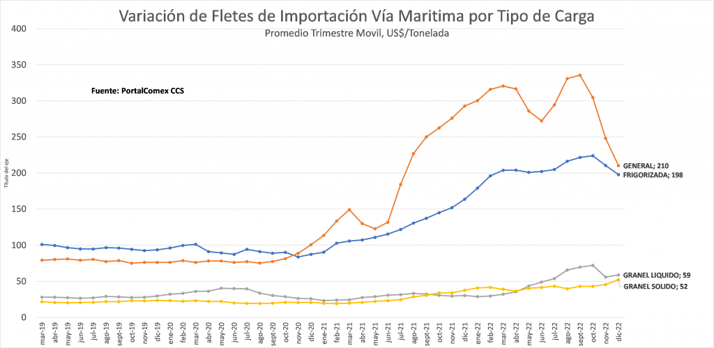 En el caso de la carga general por vía terrestre se observó una significativa alza en la primera parte del año pasado, hasta llegar a un máximo de US$ 166/ton en julio, tendencia que cambió en los siguientes trimestres, llegando a los US$ 139/ton en noviembre. Sin embargo, en el último trimestre de 2022 se produjo un rebote, incrementándose el costo del transporte de importación a los US$ 144/tonelada.
