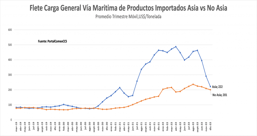 Hasta fines del año 2020, la brecha entre las tarifas de fletes de importación de la carga originada en Asia versus otros continentes era prácticamente nula, realidad que cambió a partir de 2021, en que la tarifa del transporte desde Asia se encareció muy por sobre las de otras regiones.