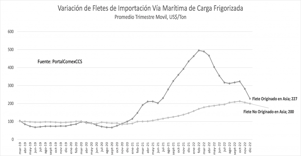 Del mismo modo, en los últimos meses estos costos han ido cayendo, hasta llegar a los US$ 227/ton en el cuarto trimestre, tendiendo a converger con la tarifa de importación de productos refrigerados desde otras regiones distintas de Asia.