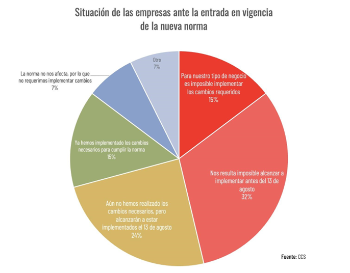 Un 24%, en tanto, aún no logra realizar dichos cambios, pero estima que logrará llegar a esa fecha. Además, del total, sólo un 15% ha logrado implementar las modificaciones, y un 7% no requerirá hacerlo, ya que la norma no les afecta.