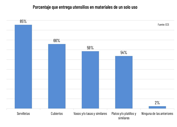 La mayoría de los establecimientos entregan materiales de un solo uso a sus clientes, siendo los más comunes, dentro de los afectados por los artículos mencionados, los cubiertos (66%), vasos, tasas y similares (59%), y platos, platillos, pocillos y similares (54%). Si bien las servilletas de papel son el material más difundido, de los textos legales se interpreta que no estarían afectadas por la prohibición.