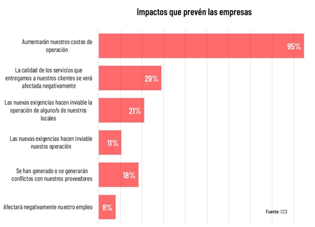 De acuerdo con una encuesta realizada por la Cámara de Comercio de Santiago (CCS) entre socios del rubro y los de la Asociación Chilena de Gastronomía en Chile (Achiga) que representan a más de 800 establecimientos de distintos segmentos, casi la mitad de las empresas (47%), no tiene posibilidades de llegar a la fecha establecida originalmente (13 de agosto de este año), y a un 15% le resulta imposible implementar los cambios exigidos, por lo que se encuentran evaluando la supervivencia de su negocio.