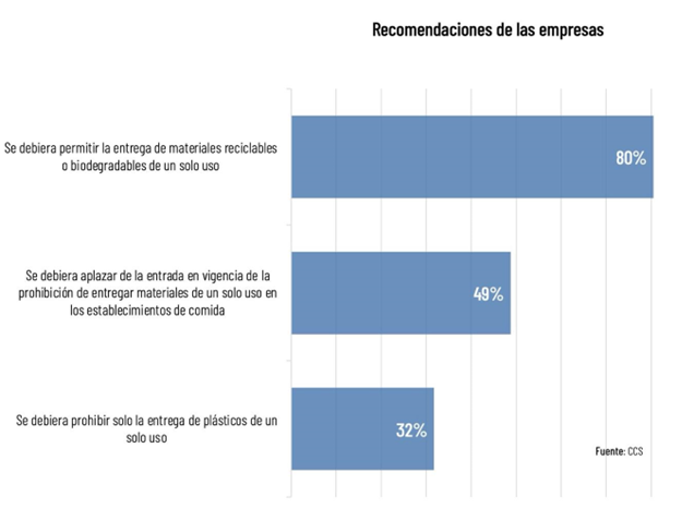 Al momento de sugerir cursos de acción, la gran mayoría de las empresas (80%) considera que se debería permitir la entrega de materiales reciclables o biodegradables de un solo, tal como consideraba originalmente el proyecto de Ley.