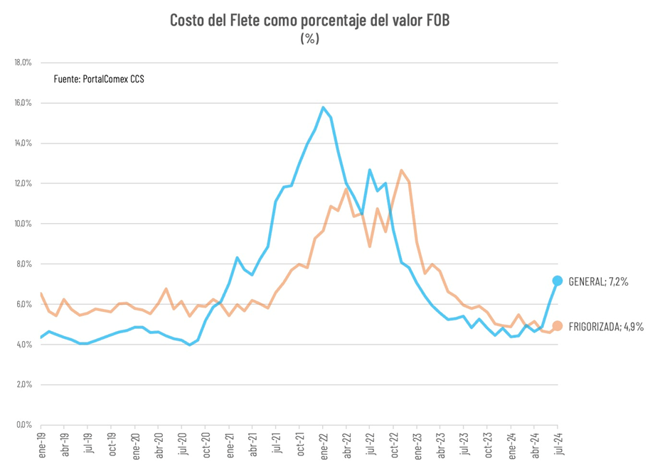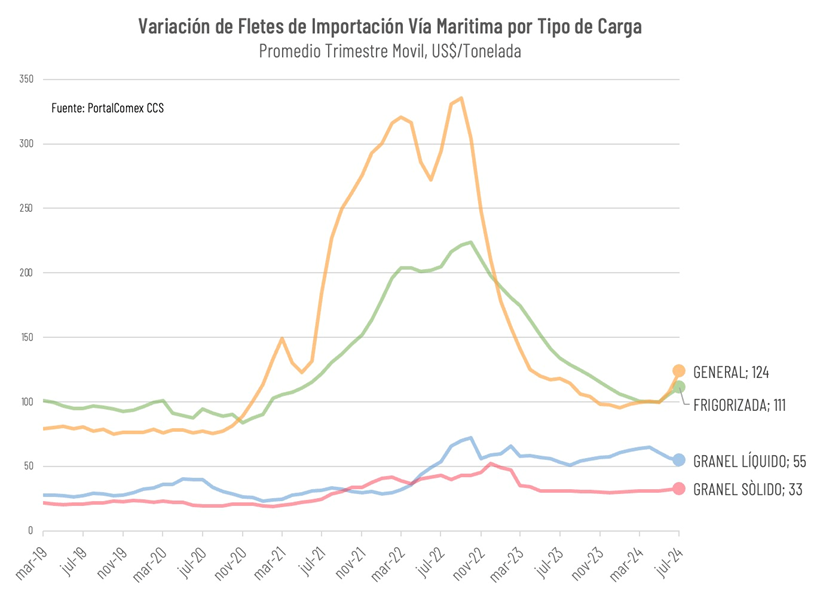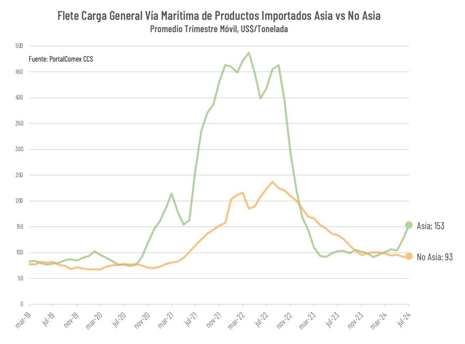 La situación se ha visto influida en forma determinante por los costos de transporte de los productos adquiridos en Asia, que en el trimestre móvil terminado en julio del presente año alcanzaron los US$153/ton, más de un 60% por sobre la tarifa observada en el comercio con otras regiones. La principal causa de este incremento es la crisis del Mar Rojo y del Canal de Suez, lo que ha obligado a las navieras a tomar rutas alternativas más largas y costosas.