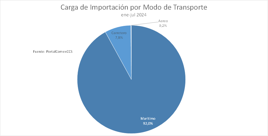 Los datos recogidos por la CCS muestran además que entre enero y julio del año en curso el 92% del tonelaje transportado por compras de bienes desde el exterior utilizó la vía marítima, mientras que el modo carretero explicó casi el 8% (alrededor de 2 millones doscientas mil toneladas). La vía aérea, por su parte, alcanzó apenas el 0,2% de la carga, con 42 mil toneladas.
