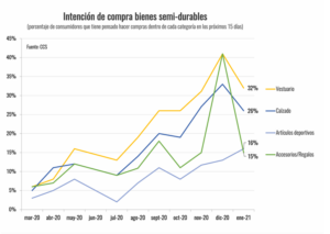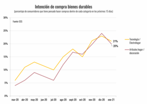 En el área de bienes de consumo durable, como tecnología, electrohogar y artículos de decoración, la intención de compra, que también se había situado en torno al 5% en marzo de 2020, bajó desde cerca del 25% en diciembre a los alrededores del 20% en enero. Esta área es posiblemente la que refleja con mayor nitidez el impacto del primer retiro de fondos previsionales, con una fuerte recuperación en septiembre pasado, producto del aumento en la demanda generado por la mayor liquidez de los hogares.
