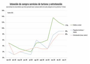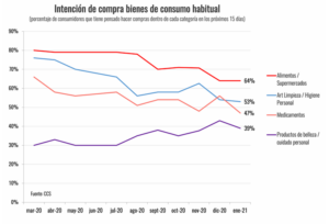 Luego de varios meses al alza, la intención de compra por parte de los consumidores retrocedió en la mayoría de las categorías de bienes y servicios durante enero de 2021, de acuerdo a la encuesta que elabora mensualmente la CCS. Los únicos rubros que presentaron alzas corresponden a artículos deportivos y comida preparada (delivery). En la mayoría de los casos, sin embargo, la disminución observada es consistente con el comportamiento estacional de la demanda, luego de la temporada navideña.
