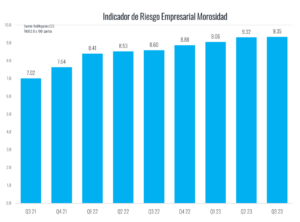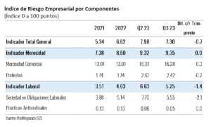Por el lado del componente financiero, el índice que mide el riesgo de morosidad en las empresas se mantuvo respecto del trimestre previo, dejando al indicador en 9,35 puntos, el nivel trimestral más alto desde que se tiene registro (2021). A nivel de componentes se observó un comportamiento mixto. El indicador que mide los protestos registró una baja de 0,2 puntos respecto del segundo trimestre, mientras que el riesgo de morosidad comercial subió 0,3 puntos.