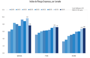 Al descomponer el Índice de riesgo general por tamaño de empresa, destaca la mejora en el segmento de las Grandes Empresas, que registran una caída de 2 puntos respecto del segundo trimestre, situándose en 7,69 puntos.