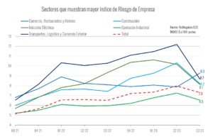 En términos de niveles, los sectores que muestran mayor nivel de riesgo son las empresas ligadas al Comercio, Restaurantes y Hoteles, con 9,28 puntos, las de Transporte, Logística y Comercio Exterior, con 8,67 puntos y las de la Construcción, con 8,21 puntos. Todos sectores que se han visto fuertemente afectados por las condiciones económicas, ante una importante caída en la demanda, sumado a las restricciones de acceso al financiamiento.