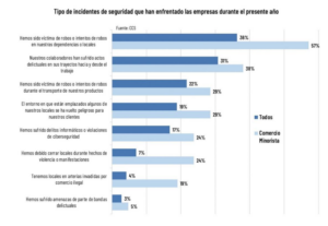 El robo de mercancías durante su transporte también es un tipo de incidente que se ha vuelto habitual para las empresas, afectando al 22% de ellas y a un 29% de las minoristas en el presente año. Para este último sector, los cierres forzados de locales durante manifestaciones o hechos de violencia llegan al 24% de las empresas, mientras que la invasión de la vía pública en que se ubican sus locales afectan al 19%.