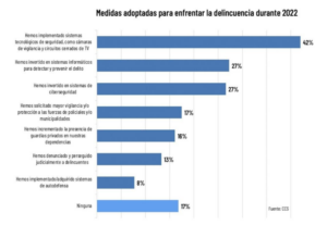 Ante estos riesgos de seguridad, las empresas han emprendido diversas acciones. La mayoría, un 42%, revela haber implementado sistemas tecnológicos de seguridad, como cámaras de vigilancia y circuitos cerrados, mientras un 27% ha invertido en sistemas informáticos para detectar y prevenir los delitos, misma proporción que ha adquirido sistemas de ciberseguridad.