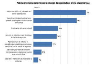 Al ser consultadas sobre el tipo de medidas prioritarias que se deberían impulsar para enfrentar esta situación, una clara mayoría de las empresas se inclina por adoptar una política de cero tolerancia contra la delincuencia (77%), y por aumentar la inversión en inteligencia policial para prevenir el delito y desarticular sus redes (64%).