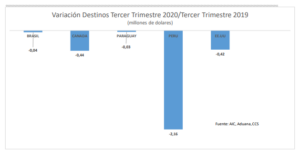 En efecto, las ventas de servicios de ingeniería al exterior apenas alcanzaron los US$ 11 millones en el tercer trimestre de 2020. La merma es explicada casi en su totalidad por el fuerte retroceso de los envíos a Perú, que cayeron en más de US$ 2 millones, representando un retroceso del 16% respecto al mismo período del año anterior. Por otra parte, se observa que prácticamente desaparecieron los envíos de servicios de ingeniería a otros destinos durante este trimestre del año, concentrándose aún más las ventas hacia Perú.