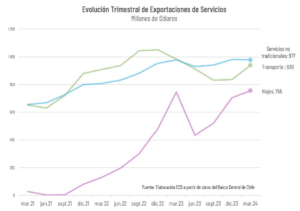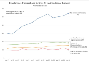 21 de junio de 2024. De acuerdo con la Cámara de Comercio de Santiago (CCS), las exportaciones de servicios no tradicionales -que incluyen telecomunicaciones, informática e información, servicios financieros, seguros y pensiones, servicios personales, culturales y recreativos y servicios empresariales- alcanzaron US$ 977 millones en el primer trimestre del presente año, manteniéndose por cuatro trimestres consecutivos como líderes de los envíos de intangibles al exterior y acercándose a la marca de los mil millones de dólares trimestrales.