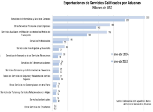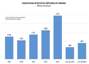 El gran dinamismo observado en los últimos años se extiende también a los primeros meses de 2024. En efecto, entre enero y abril, los servicios calificados como exportación por Aduanas se han expandido un 35% respecto a igual período del año pasado, superando los US$ 900 millones.