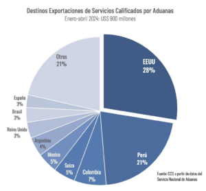 Respecto de los destinos, el principal mercado corresponde a Estados Unidos, con un 28% del total, destacando los servicios de suministro de hosting, apoyo técnico en computación, diseño de software y servicios de filmación de películas. Le sigue Perú, con un 21%, en exportaciones de servicios de mantenimiento y reparación de aviones y helicópteros, apoyo técnico en computación e informática, asesoría en proyectos de ingeniería, gestión en marketing y servicios de ingeniería para la minería del cobre.