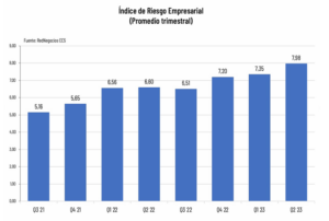 El Índice de Riesgo Empresarial que elabora RedNegocios de la Cámara de Comercio de Santiago, alcanzó en el segundo trimestre su mayor nivel desde que se inició su medición, en julio de 2021. El indicador promedió 7,98 puntos en el período, 0,6 por encima del trimestre anterior y 2,8 puntos arriba del tercer trimestre de 2021, cuando promedió 5,16 unidades.