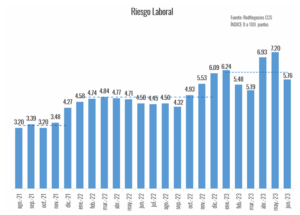 El componente laboral mostró una importante mejora, al caer 1,4 puntos respecto de mayo, donde el subindicador de riesgo en cumplimiento de compromisos laborales explicó en gran medida esta dinámica, al bajar en 1,6 puntos. El indicador que mide las prácticas, en tanto, se mantuvo sin variación. Con lo anterior, el indicador de Riesgo Laboral pasó de 7,20 puntos en mayo a 5,76 puntos en junio.
