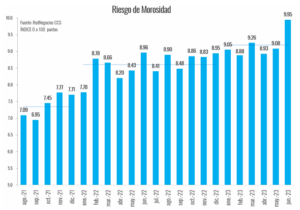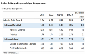 El índice que mide el riesgo de morosidad en las empresas, en tanto, aumentó 0,9 puntos respecto de mayo recién pasado, ubicándose en 9,95 puntos en junio. El componente morosidad explicó buena parte de estos resultados, al mostrar un alza de 1,6 puntos respecto de mayo. Mientras, el riesgo de protestos subió 0,1 punto en relación al mes previo.