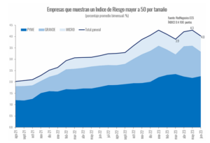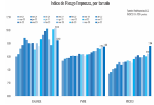 En el segmento de las PYMEs, en tanto, se produjo un aumento mensual de 0,1 puntos, alcanzando las 7,55 unidades en junio. Esto fue resultado de un aumento del riesgo de morosidad (0,6 puntos) y una disminución en el indicador laboral (-0,4 puntos).