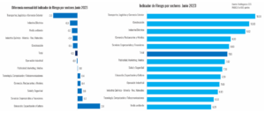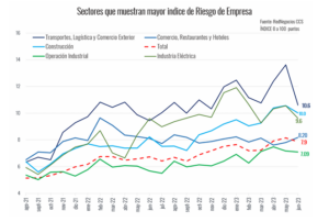 A nivel de sectores de actividad, se observó un comportamiento mixto. De los 12 rubros considerados en el indicador de riesgo, 7 mostraron una mejoría respecto de mayo, liderados por las empresas de Transportes, Logística y Comercio Exterior, con una caída mensual de 3 puntos.