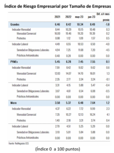 El Índice, que adopta valores entre 0 y 100 puntos, donde 100 representa el mayor nivel de riesgo, se elabora a partir de indicadores laborales (cumplimiento de obligaciones laborales y prácticas sindicales), y de morosidad (cumplimiento comercial y protestos). La base de cálculo se construye a partir de los indicadores de más de 6 mil empresas al mes, las cuales forman parte del registro deproveedores de RedNegocios de la CCS.