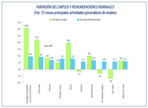 A nivel sectorial, y en términos nominales, las actividades de alojamiento y servicios de comidas, duramente golpeadas durante el confinamiento, encabezaron el crecimiento del empleo en diciembre, con un 30,9% en 12 meses, seguidas por el sector construcción (22%), minería (19,8%) y el comercio (8,5%). A continuación se ubicaron la industria manufacturera (10,1%),salud y asistencia social (6,6%) y transporte y almacenaje (5%). En el otro extremo, se observan caídas en el empleo de los sectores financiero y seguros (-3,1%), enseñanza (-1,5%) y en la administración pública (-6,4%).