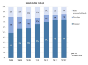 Quienes se mantienen trabajando en modalidad totalmente remota, en tanto, se estabilizan en torno al 10% (11% en el último trimestre), lejos del 31% de mediados de 2021, y la modalidad mixta retrocede levemente a un 15%. De este modo, un 26% permanece en alguna forma de teletrabajo (total o parcial), cifra muy similar a la del trimestre anterior, dejando atrás el 51% del segundo trimestre de 2021.