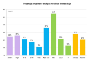 Desde el punto de vista geográfico, la proporción de teletrabajo es mayor en la capital (28%) en comparación con regiones (21%).