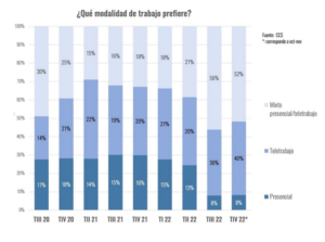 De hecho, pese al contundente aumento de la presencialidad en los últimos meses, en promedio el 92% de los encuestados preferiría trabajar en alguna modalidad de empleo remoto. De ellos, un 42% lo haría en modalidad completamente a distancia y un 52% se inclina por un sistema híbrido de presencialidad y teletrabajo.