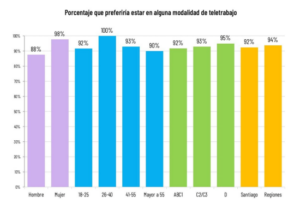 Las mujeres manifiestan una mayor preferencia por esquemas remotos de trabajo, con un contundente 98% (vs 88% de los hombres).