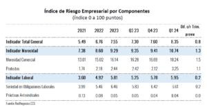 En casi todos los componentes se evidenció que el deterioro observado durante el año pasado continuó en la primera parte de este año, alcanzando la mayoría de ellos sus niveles más altos de los últimos años, a excepción del indicador de prácticas antisindicales, que se ha mantenido estable durante el período analizado. La situación más preocupante se observa en la morosidad comercial, que superó los 18 puntos en el primer cuarto de este año, luego de que en el último cuarto del año pasado sobrepasara los 16 puntos, mostrando con ello un deteriora más persistente en el componente financiero del riesgo.