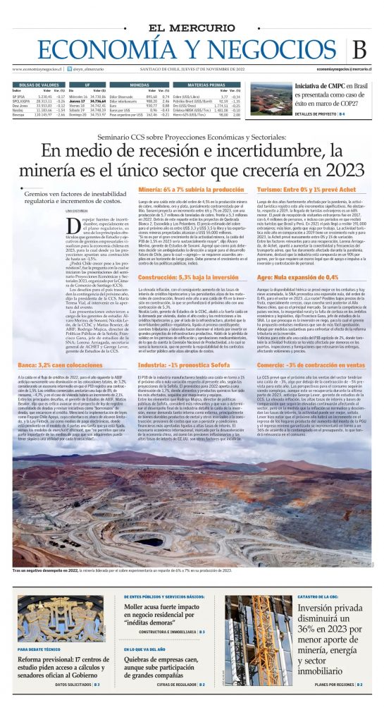 Despejar fuentes de incertidumbre, especialmente en el plano regulatorio, es uno de los principales obstáculos que gerentes de Estudio y ejecutivos de gremios empresariales visualizan para la economía chilena en 2023, para la cual desde ya las proyecciones apuntan una contracción de hasta un -1,5%. ¿Podrá Chile crecer pese a los pronósticos?, fue la pregunta con la cual se iniciaron las presentaciones del seminario Proyecciones Económicas y Sectoriales 2023, organizado por la Cámara de Comercio de Santiago (CCS). Los desafíos para el país trascienden la contingencia del próximo año, dijo la presidenta de la CCS, María Teresa Vial, al intervenir en la apertura del evento. Las presentaciones estuvieron a cargo de los gerentes de estudio: Álvaro Merino, de Sonami; Nicolás León, de la CChC y Matías Besnier, de ABIF; Rodrigo Mujica, director de Políticas Públicas de la Sofofa; Francisco Gana, jefe de estudios de la SNA; Lorena Arriagada, secretaria general de ACHET y George Lever, gerente de Estudios de la CCS.