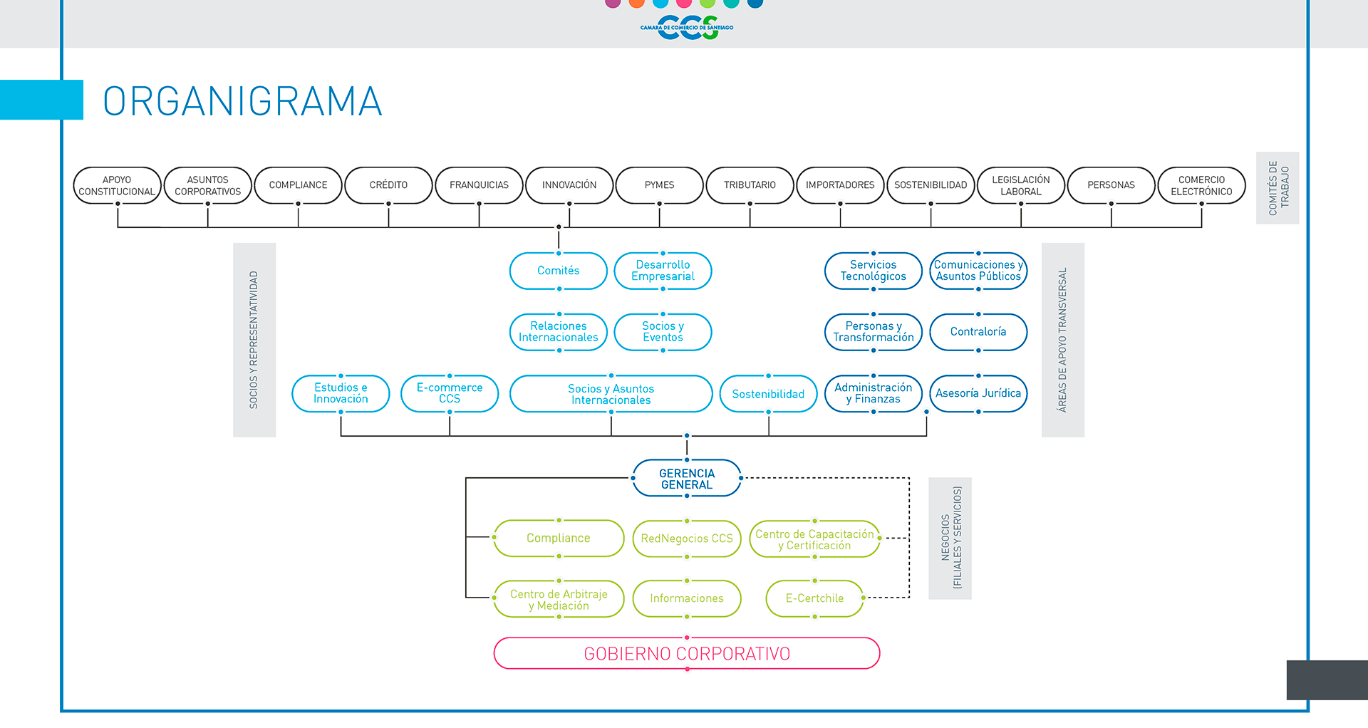 La Cámara de Comercio de Santiago cuenta con una estructura organizacional que promueve una gestión eficiente y colaborativa. Su organigrama está encabezado por el Directorio, compuesto por destacados representantes del mundo empresarial. Bajo su dirección, la Gerencia General coordina las distintas áreas estratégicas. Esta estructura permite a la CCS responder de manera ágil a los desafíos del entorno empresarial y entregar valor a sus asociados.