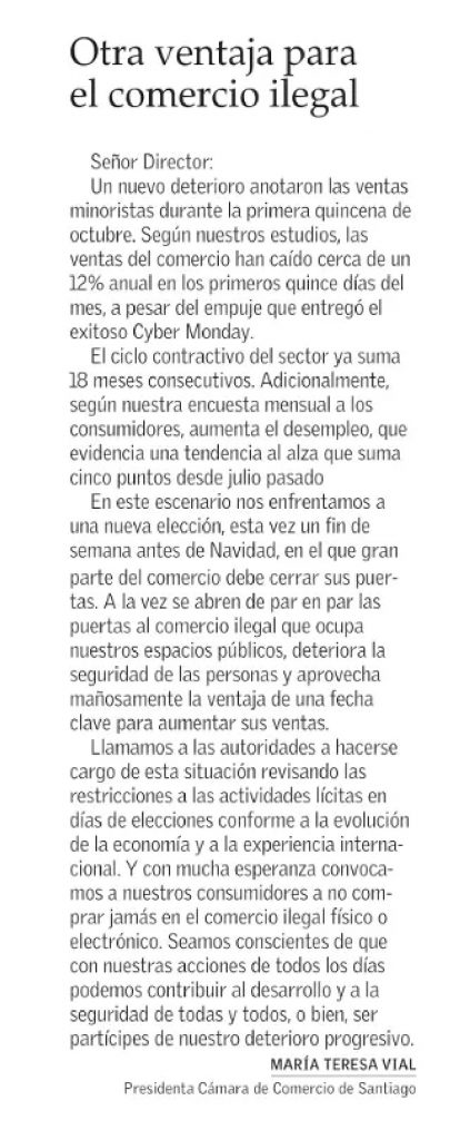 En este escenario nos enfrentamos a una nueva elección, esta vez un fin de semana antes de Navidad, en el que gran parte del comercio debe cerrar sus puertas. A la vez se abren de par en par las puertas al comercio ilegal que ocupa nuestros espacios públicos, deteriora la seguridad de las personas y aprovecha mañosamente la ventaja de una fecha clave para aumentar sus ventas.